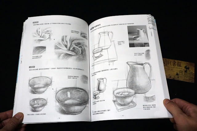 第二章節介紹素描知識,測量方式、切割法、構圖、遠近、立體結構與固有色調等等